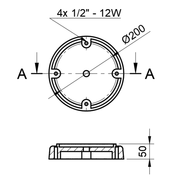 Linea: R198Altura: 50 mmFijación: 4 roscas 1/2″ -12W a 200mm